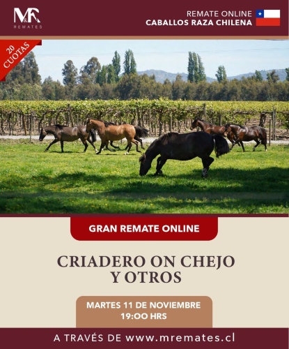 El Criadero On Chejo, propiedad de Sergio Cardemil, y otros criadores, tienen este martes 11 de noviembre desde las 19:00 horas un atractivo remate de Caballos Raza Chilena.