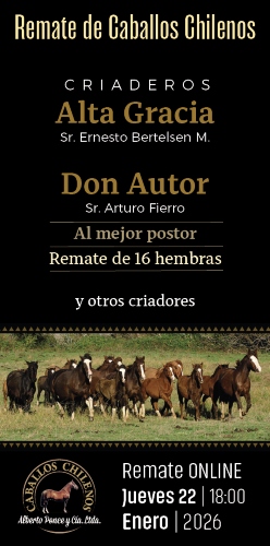 Los Criaderos Alta Gracia, de Ernesto Bertelsen, y Don Autor, de Arturo Fierro, tienen este jueves 22 de enero desde las 18:00 horas un atractivo remate de Caballos Raza Chilena.