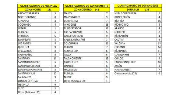 Para cada uno de los Clasificatorios, se ha establecido un total de 44 cupos directos al Campeonato Nacional, distribuidos de la siguiente forma: