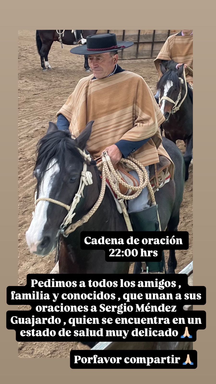 La Asociación de Rodeo Santiago informó de la realización de una cadena de oración por la salud de Sergio Méndez Guajardo, socio del Club de Rodeo La Cisterna.